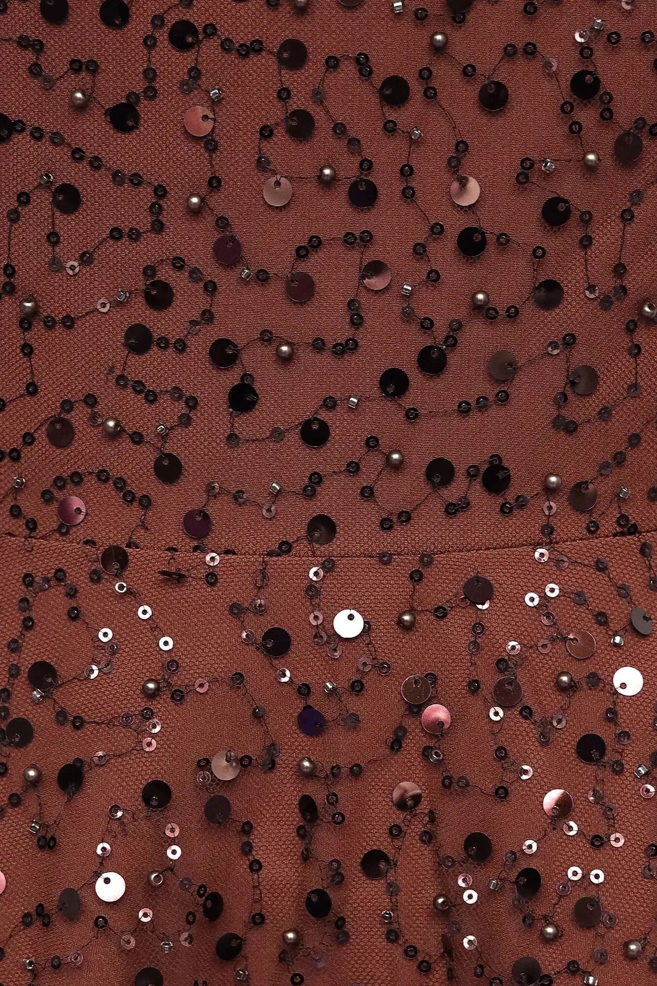 Vestido midi com decote quadrado e alças largas em tom chocolate sofisticado. Confeccionado em tecido brilhante bordado com paetês e miçangas, o modelo entrega um visual luxuoso com alto impacto visual. A saia com volume adiciona leveza ao movimento, proporcionando um efeito fluido e elegante ao caminhar. Possui forro interno para maior conforto e zíper invisível nas costas para acabamento impecável.