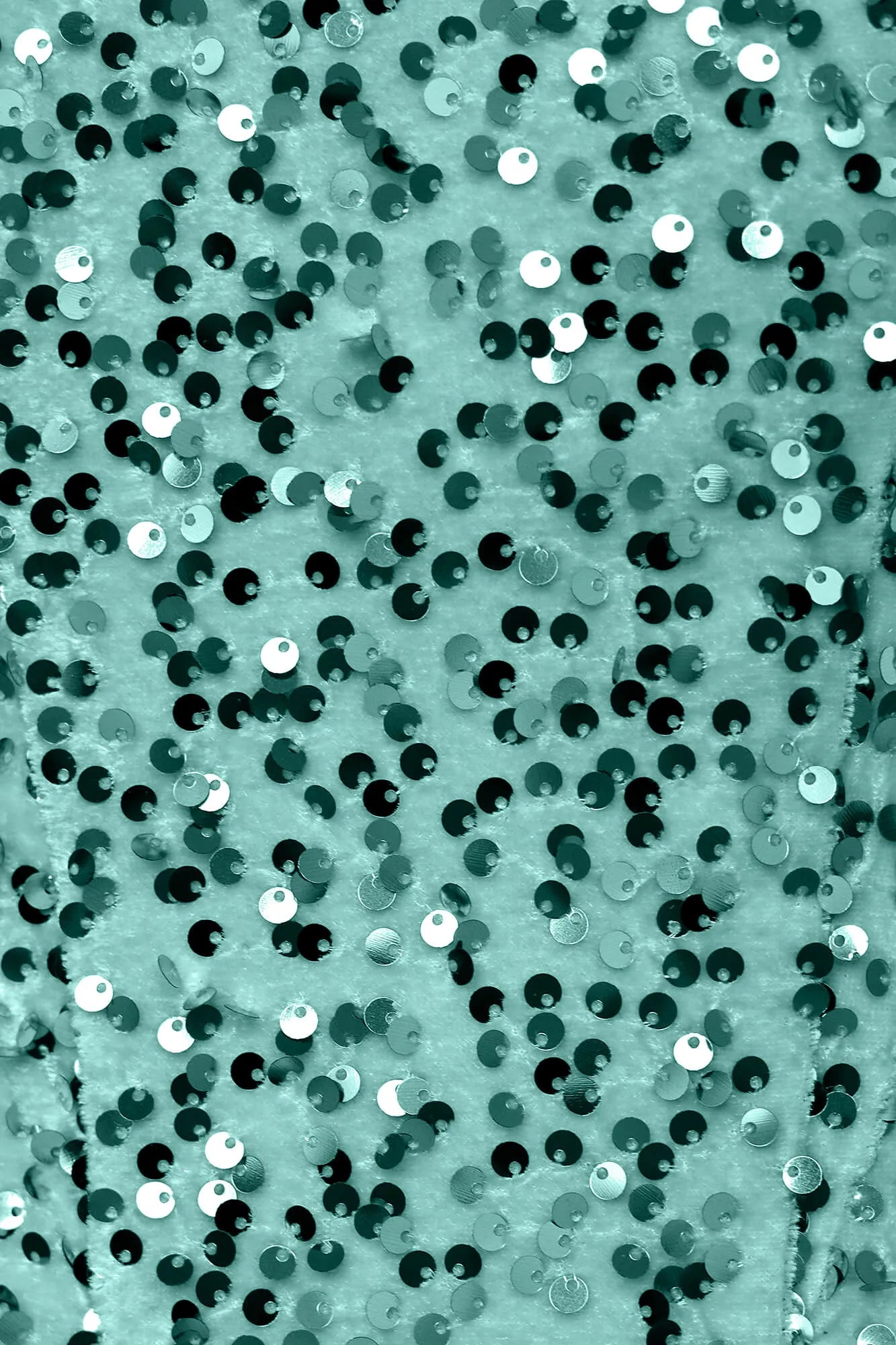 Vestido midi confeccionado em veludo com brilho intenso e bordado em paetês, em um sofisticado tom menta. A peça possui corset estruturado com recortes que modelam o corpo com perfeição, definindo a cintura e realçando a silhueta. As alças largas proporcionam sustentação e equilíbrio visual, enquanto o decote profundo destaca delicadamente o colo e as clavículas.