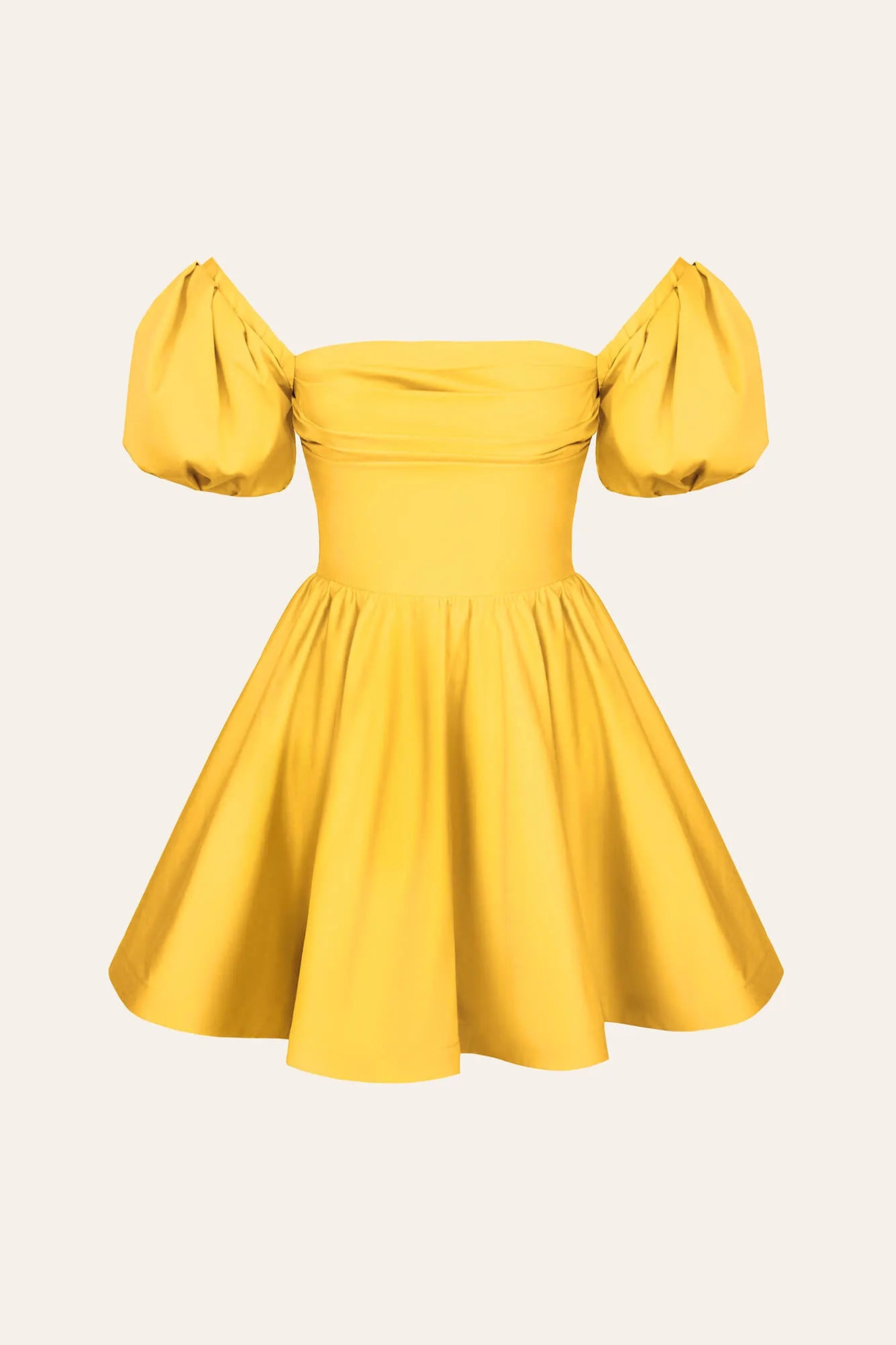 Vestido mini em tom amarelo vibrante, com busto drapeado e mangas bufantes que criam um visual romântico com toque moderno. A modelagem ajustada na parte superior valoriza a silhueta, enquanto a saia levemente volumosa traz leveza e movimento ao look. O decote quadrado evidencia o colo e alonga a região do pescoço, deixando o visual feminino e encantador.